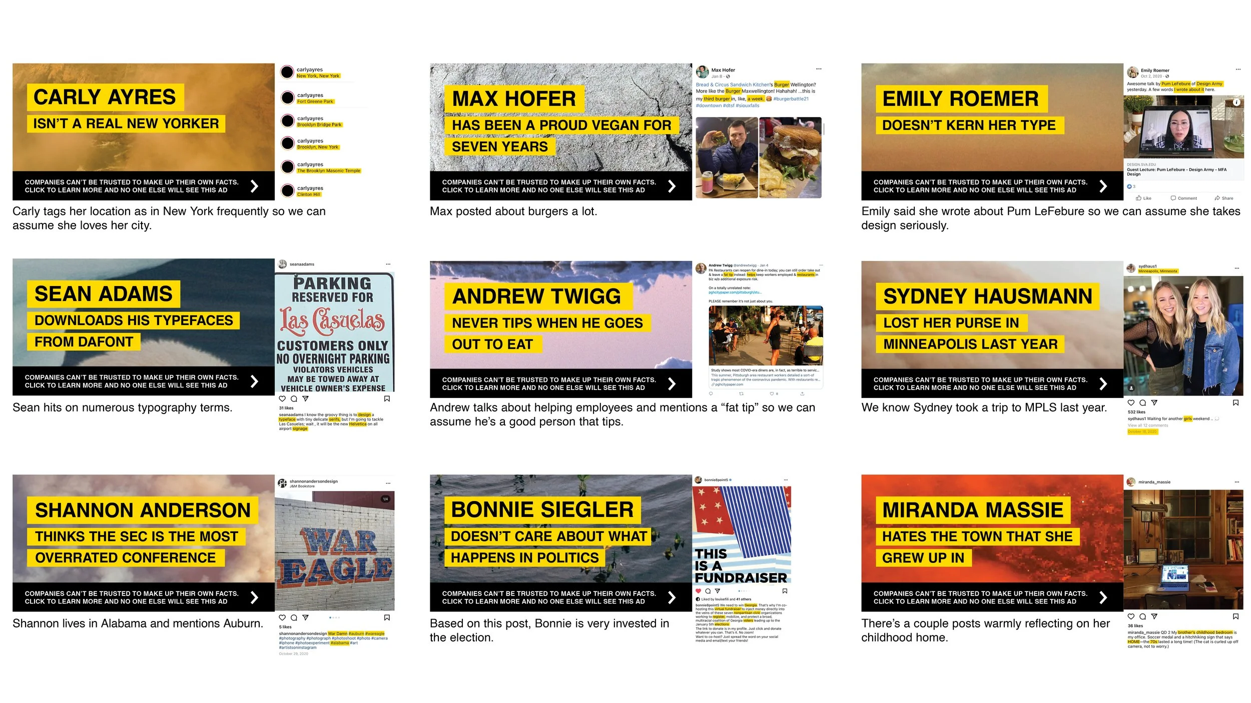 For the competition, I created ads of strangers I knew would be tuning in by finding the event RSVP list and combing through their social media.